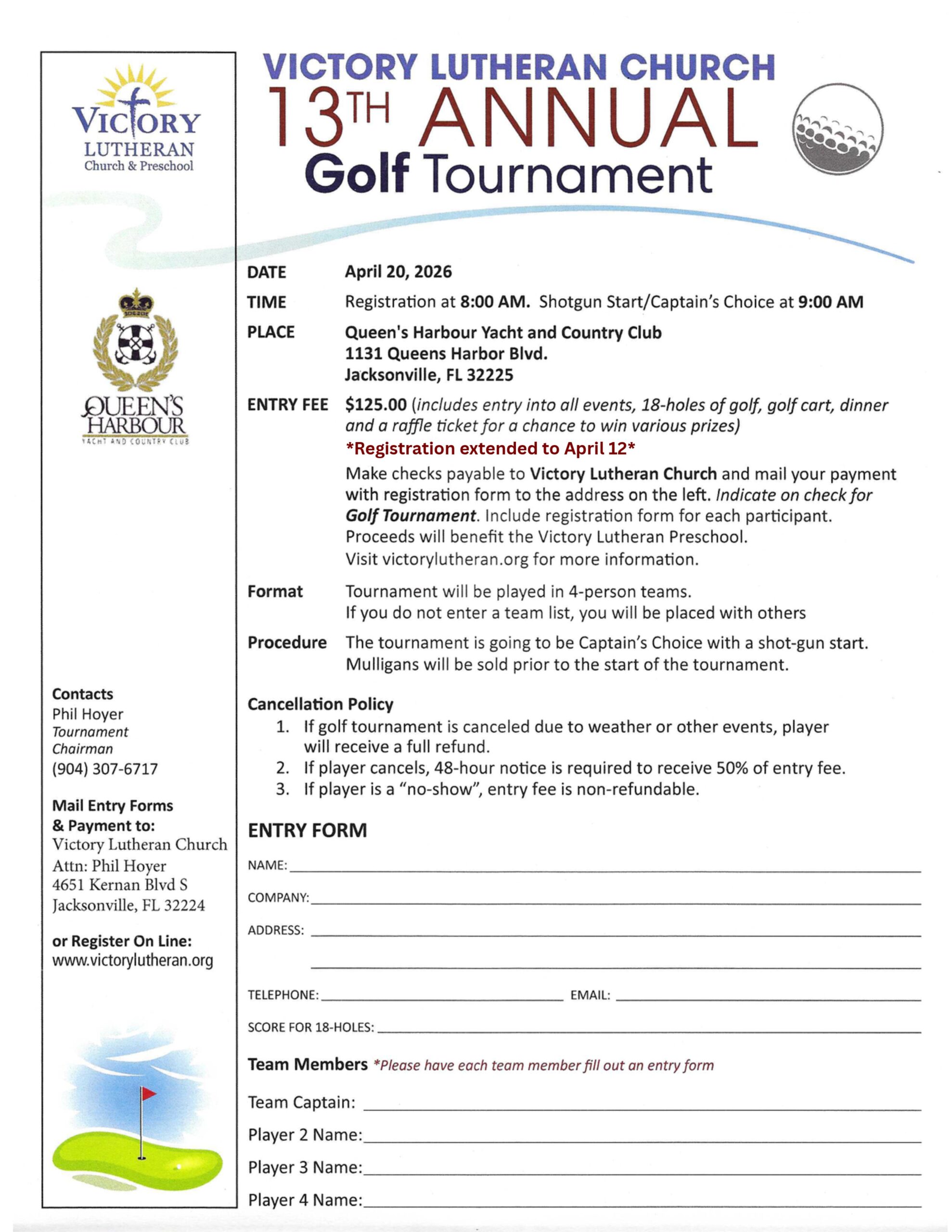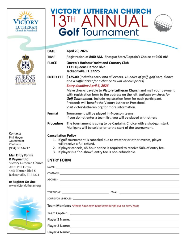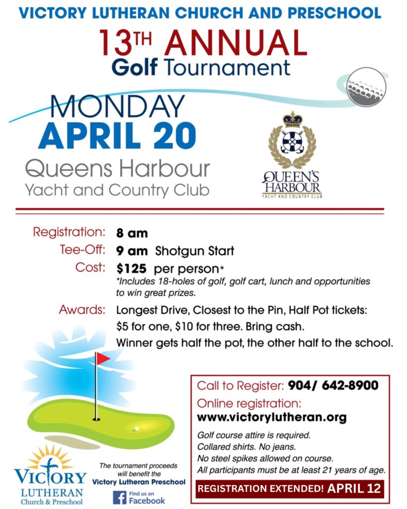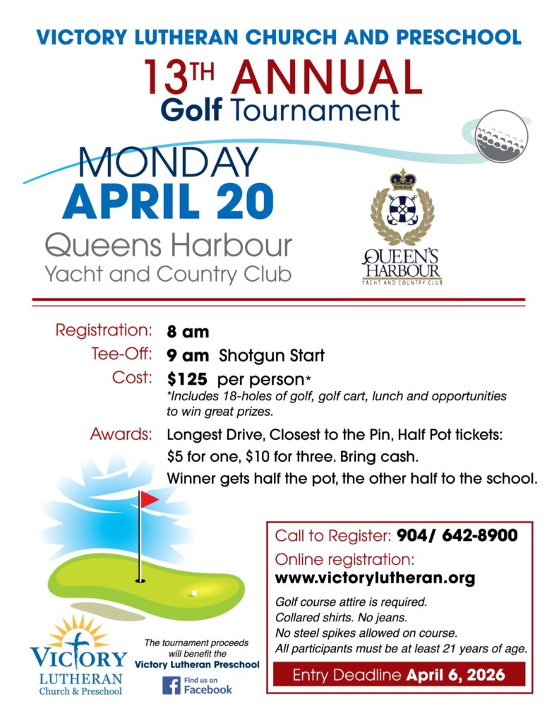 The 13th Annual Victory Lutheran Church and Preschool Golf Tournament is set for Monday, April 20, 2026. It will take place at Queen’s Harbour Yacht and Country Club. Register below. Extended entry deadline: April 12, 2026.